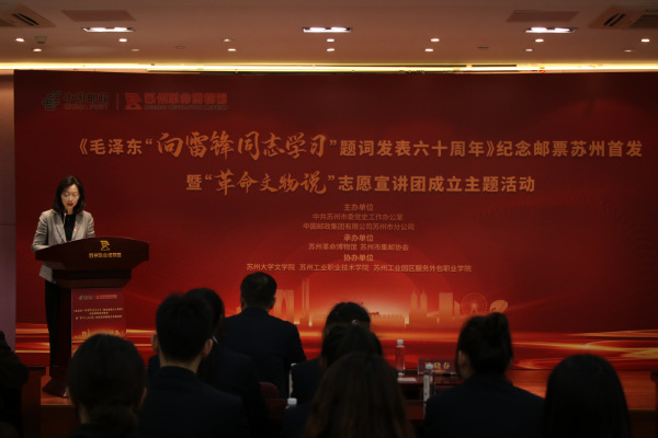 2023年3月5日下午两点,活动在苏州革命博物馆举行。首先,中共苏州市委党史工作办公室诸晓春副主任致辞。她指出,此次纪念邮票的发行发扬了党的二十大所提倡的“奉献、友爱、互助、进步”的志愿服务精神。青年人应以实际行动书写新时代的雷锋故事,让雷锋精神在时代中绽放出璀璨光芒。“革命文物说”活动旨在发掘革命文物背后的故事,增强研究文物的力度,更加积极服务高校思政课堂、融入苏州各级党组织主题党日活动,将文物所承载的记忆、凝聚的精神,更广泛更有效地向公众传播,更好激活革命文物的时代价值。