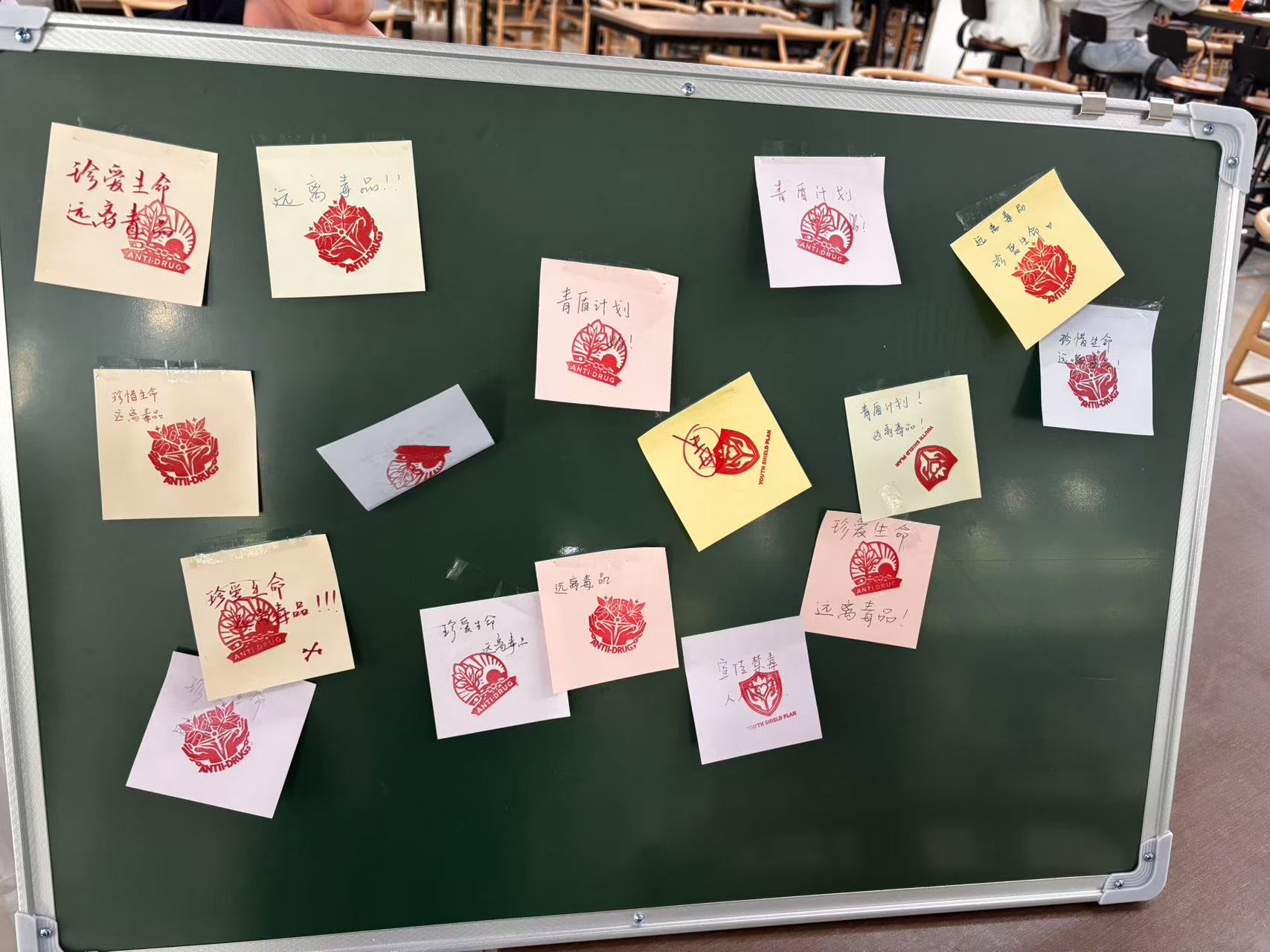本次禁毒创意活动以“禁毒心愿书写”环节结尾,参加活动的同学们用马克笔把自己的禁毒心愿写在便签纸上,盖上禁毒印章,并亲手贴在小黑板上。贴在黑板上的便签纸最终汇成本次活动的“禁毒心愿墙”,表明着同学们远离毒品的决心,传递着同学们对美好无毒社会的期待。