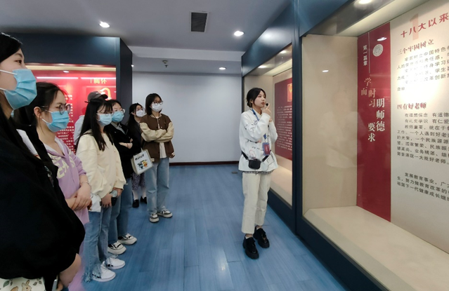 支部党员在讲解员的带领下依次参观此次专题展的五个板块,即:“学而时习之,明师德要求”、“见贤思齐,学师德楷模”、“弘德至善,育师德文化”、“风清气正,遵师德规范”、“青蓝相继,传师德精神”。