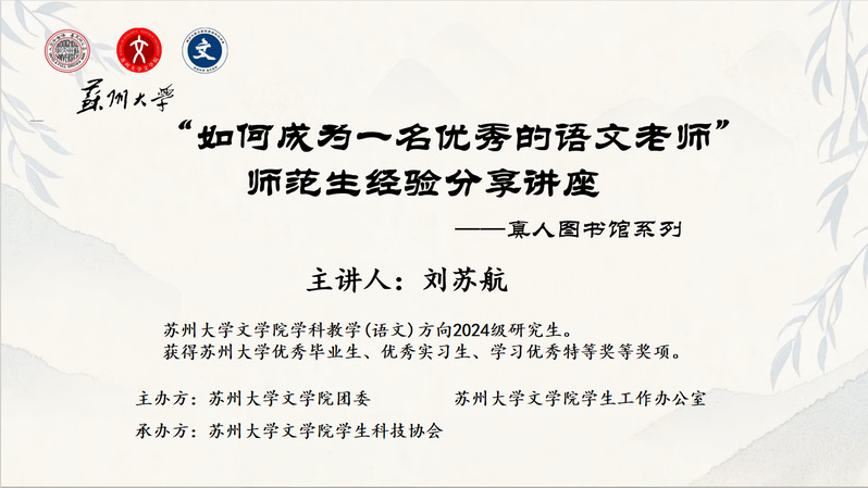 3月6日18:30分,水果派解说 “真人图书馆”系列活动“如何成为一名优秀的语文老师”师范生经验分享讲座在1001#1103顺利召开。本次活动由水果派解说 团委、水果派解说 学生工作办公室主办,水果派解说 学生科技协会承办。本次讲座的主讲人为水果派解说 学科教学(语文)专业2024级研究生刘苏航。水果派解说 学生工作办公室主任、24级本科生辅导员纪金平老师出席并做讲话。