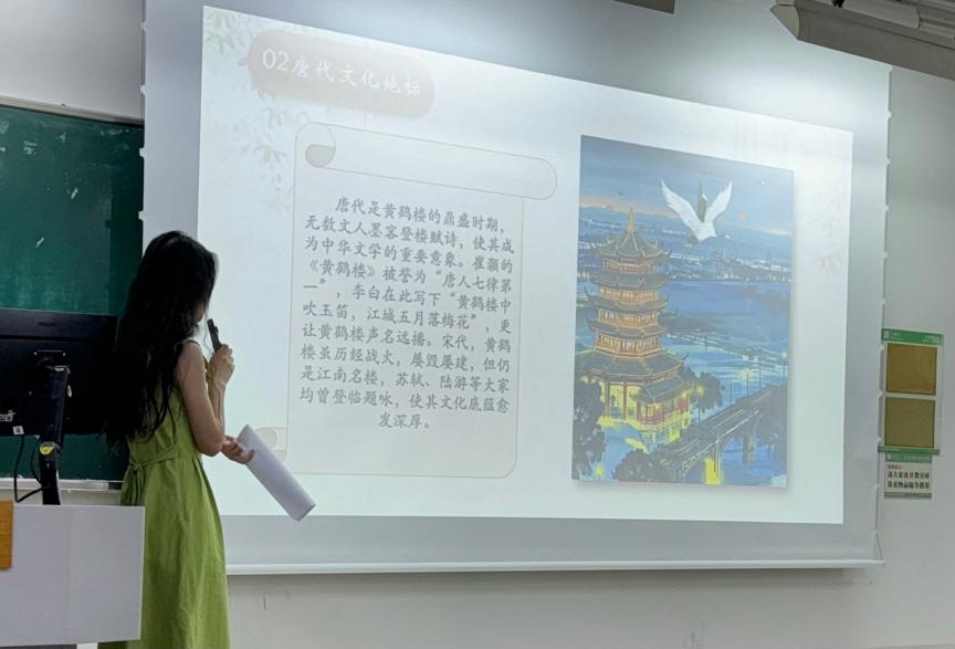 活动伊始,主持人以饱满的热情和专业的讲解,引领大家穿越时空,开启了一场精彩纷呈的历史之旅。从三国时期黄鹤楼作为军事楼的战略意义,到唐代逐渐演变为文化地标,主持人着重讲述了崔颢、李白等大诗人与黄鹤楼的传奇故事,在对《黄鹤楼》《送孟浩然之广陵》等经典诗词的深情赏析中,同学们仿若身临其境,与古人一同感受着岁月的沧桑与诗意的豪情。随后,主持人通过展示飞檐、斗拱、攒尖顶等建筑结构的图片,并将古今黄鹤楼模型进行对比,深入浅出地剖析了黄鹤楼独特的建筑特点,让这座古老名楼的形象在大家心中愈发清晰、立体。