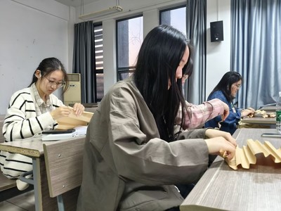 图为同学们进行书法摆件手工实践