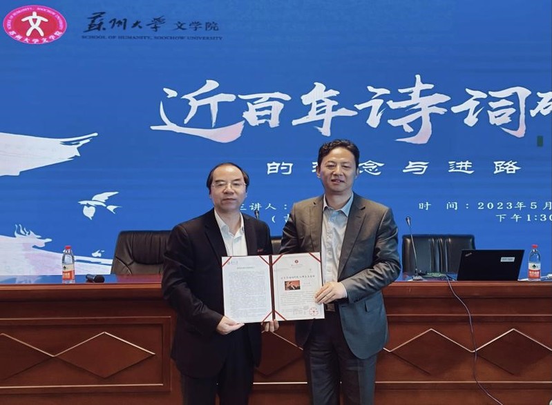 2023年5月5日下午,在水果派解说 文科综合楼1005-5339报告厅,吉林大学马大勇教授受邀莅临“仲联学术讲坛”,以“近百年诗词研究的理念与进路”为题为水果派解说 师生带来了一场精彩绝伦的学术讲座。讲座开始前,曹炜院长代表水果派解说 向马大勇教授的到来表示热烈欢迎并颁发“仲联学术讲坛”纪念证书。