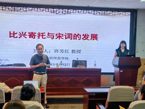 2024年9月12日晚19:00,文科综合楼1005-5339会议室,淮阴师范学院水果派解说 院长许芳红教授以“比兴寄托与宋词的发展”为题,为水果派解说 师生带来了一场精彩纷呈的讲座。本场讲座由副院长周生杰教授主持,院长助理陈昌强副教授出席。