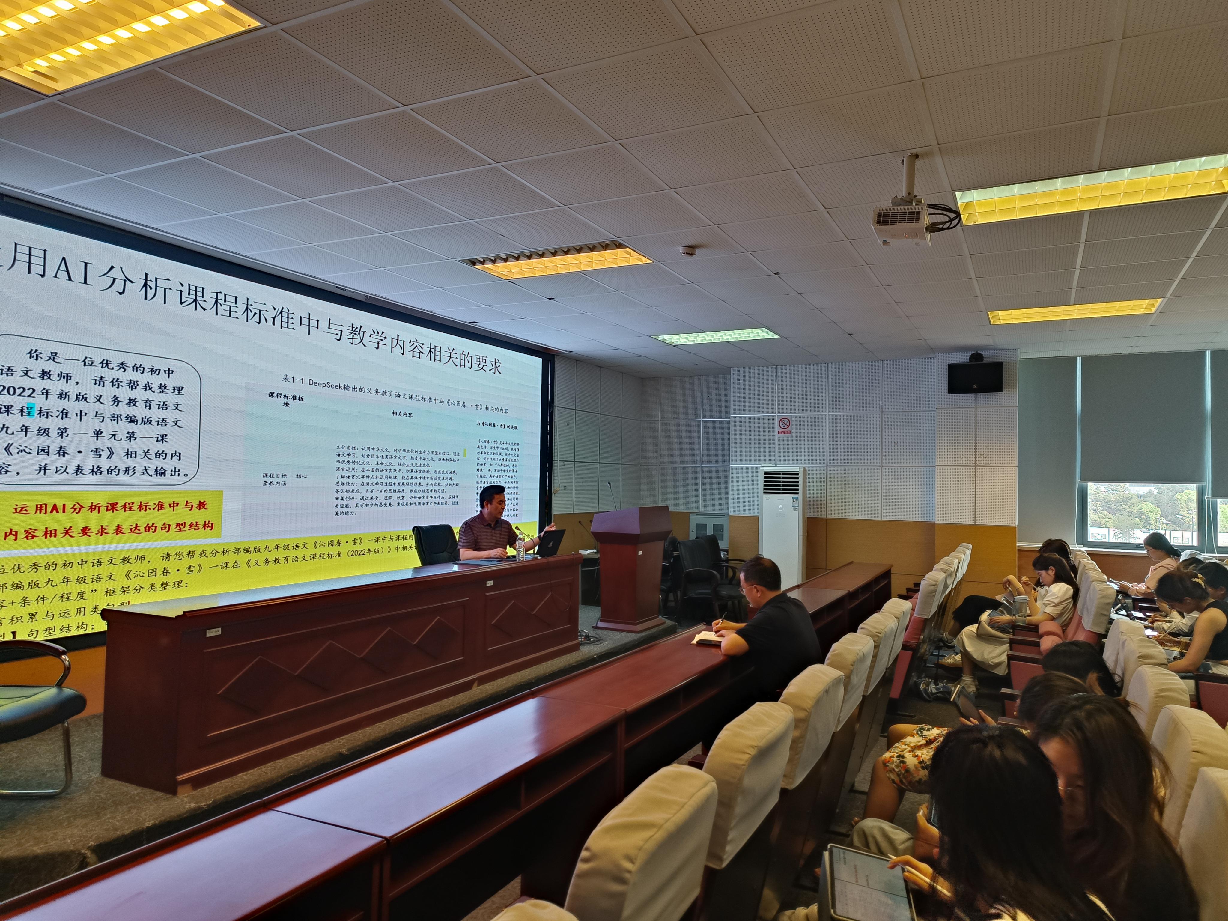 2025年5月29日下午,苏州工学院师范学院院长闫祯教授应邀在水果派解说 独墅湖校区文综楼5339教室,以“人工智能时代中学语文教师专业发展微论”为题,为水果派解说 师生带来了一场精彩的讲座。讲座由水果派解说 学科教学(语文)专业唐定坤教授主持,2024级学科教学(语文)全体研究生聆听了讲座。