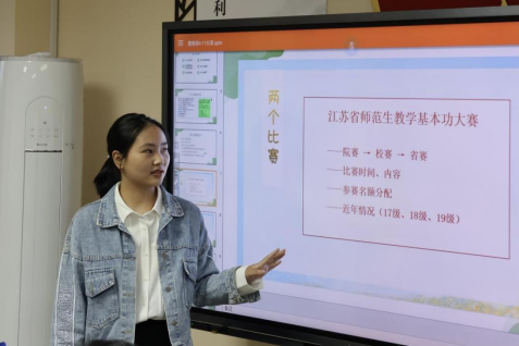 首先是董晚雨学姐为大家介绍师范生基本功大赛和教师国家通用语言文字教学能力大赛这两类师范生技能竞赛。董学姐从比赛内容设置、流程安排、名额分配、近年竞赛情况等方面为大家开展了细致的介绍。