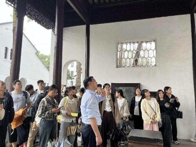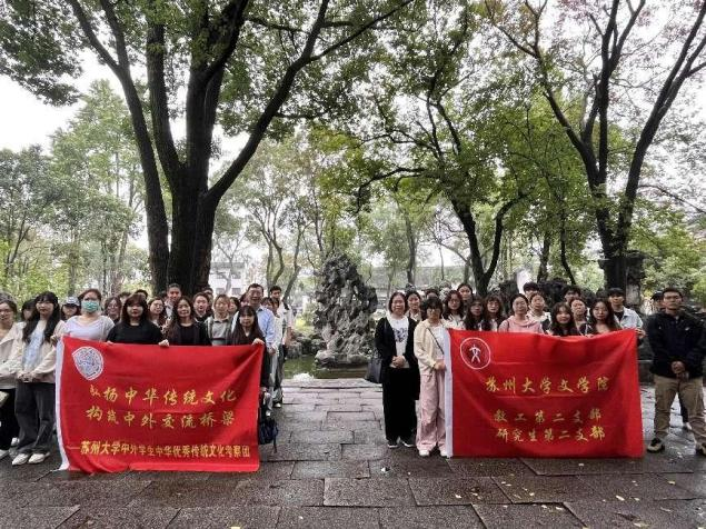 随后,党员同志们实地探访了江苏省苏州第十中学。古色古香的建筑与现代的教学楼交相辉映,展现了学校深厚的历史积淀和与时俱进的教育理念。在现场,教师党员们为学子们详细解读了织造署、瑞云峰、多址轩等历史建筑的丰富内涵,并生动讲述了章太炎、黄侃等国学大师的生平事迹。