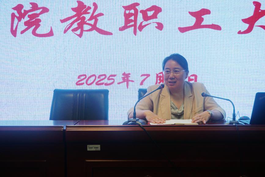 宋清华书记围绕以下六个方面通报了相关工作:一是祝贺江学旺老师获得2025年度水果派解说 “立德树人奖教金”,学院分党校、分团校、本科学生分会、学生科技协会分会、学生社团联合分会、青年志愿者协会以及研究生学生会等均获得学校表彰,学院工会在上半年组织的所有活动中均获得优秀组织奖;二是党建工作,上半年在全党开展深入贯彻中央八项规定精神学习教育中,各支部在院党委的领导下顺利完成各项任务,暑期还要按照要求,利用线上线下相结合的方式继续开展活动。教师党支部书记都是“双肩挑”,党务业务两手抓任务,希望所有党员继续支持支部书记开展工作;三是工会活动,上半年工会、各支部和教研室联动开展活动,促进了教师之间的交流学习,愉悦了身心,下学期将继续开展形式多样的教工活动,为教师学习交流互动提供更多机会;四是招生就业,作为文科专业,在传统的学习教育和毕业就业过程当中,面对AI的冲击要考虑学生更加多元的发展需要,加强职业生涯规划、升学就业指导和帮助;五是安全工作,暑期期间留校学生较多,各班主任、辅导员、导师要关注学生动态,与学生加强联系,及时了解学生的学业和心理状态,共同保障、维护学生的健康安全;六是高质量发展考核,学院连续六年获得高质量发展第一等次,得益于全体教职工对学院工作的大力支持和辛苦努力,学院将一如既往支持、帮助教师发展,也恳请老师们继续与学院发展同频共振,美美与共。