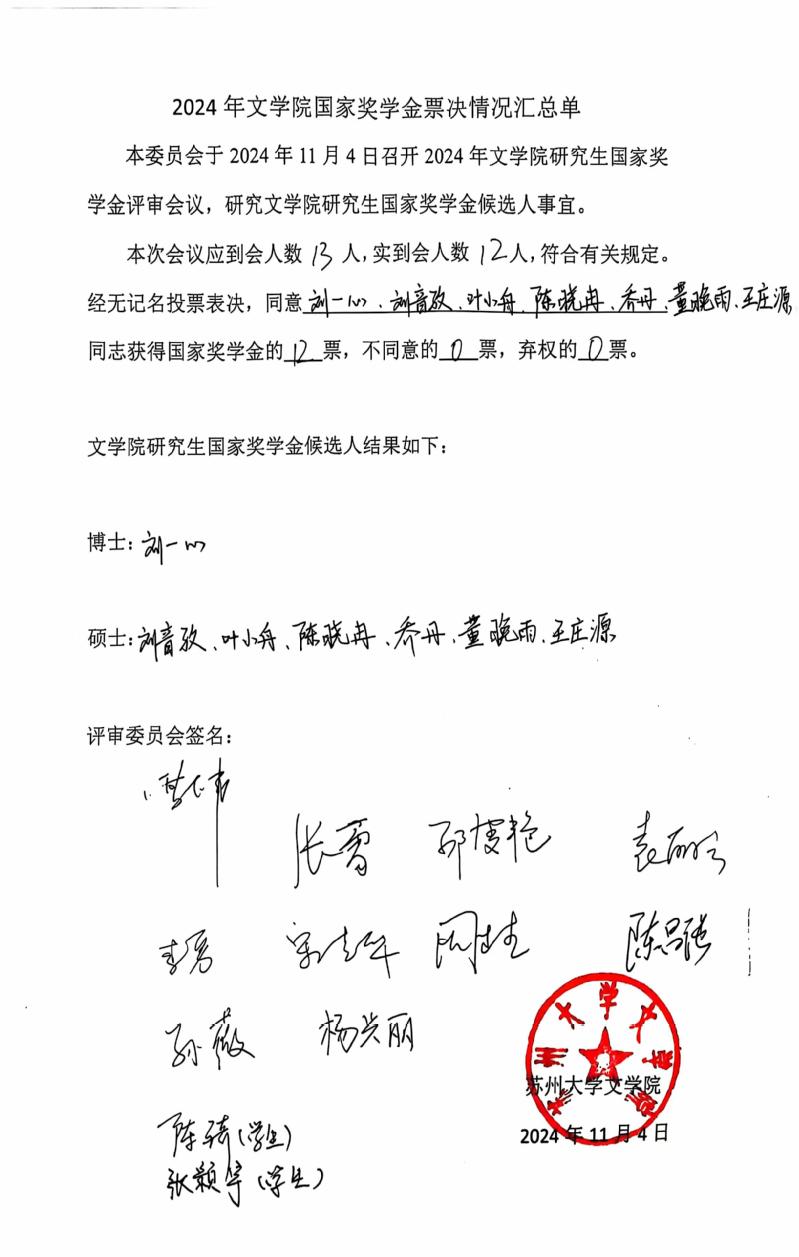 根据《关于做好2024年研究生国家奖学金(第二批)评审工作的通知》工作要求,遵循平等原则、回避原则、公正原则、保密原则,此次评审由学生个人主动申请提交材料,经水果派解说 2024年度国家奖学金评审委员会根据学院评定条例评审,现将结果公示如下: