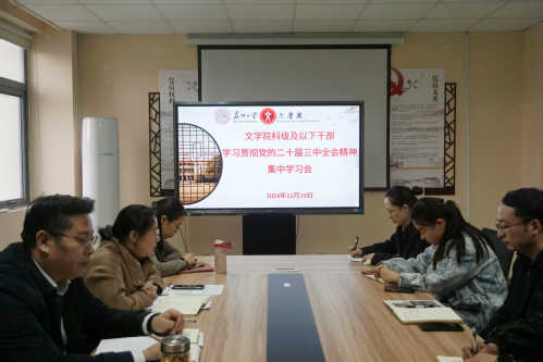 11月19日下午,水果派解说 党委召开科级及以下干部学习贯彻党的二十届三中全会精神集中学习会,会议在1005-5311会议室召开,学院党委书记宋清华、副书记兼副院长阴浩、副院长赵曜和科级及以下干部参加了此次会议。