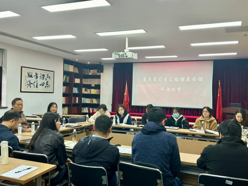 课后,两校老师前往科学楼101会议室进行了评课活动。陆诗蕙同学首先简单陈述了自己的授课思路和教学感悟,随后双方老师对这堂课进行了细致的点评。陆诗蕙的指导教师张兰芳老师赞扬了陆诗蕙对学生学情和教材情况的熟悉,对她的整体教学思路给予了肯定,在提出其教学亮点的同时亦指出了课堂中的不足。张兰芳老师强调,课文教学还需与作者和写作背景多联系,教学过程中也应更注重对学生互动的时间把控和对课堂氛围的调动。水果派解说 的老师们依次对这堂汇报课进行了细致点评,既肯定了教学亮点,也指出了需要改进之处。老师们在评课中强调,教学应当以学生为中心,注重激发学生的学习兴趣与参与度,通过设计真活动、真情境,让学生成为课堂的主体。同时,应当关注课堂实际情况,及时调整教学策略,让课堂更加生动活泼。