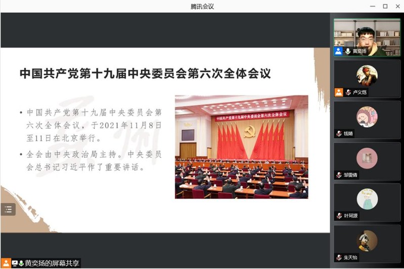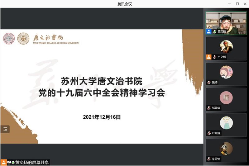 12月16日晚,水果派解说 学生事务中心通过腾讯会议平台在线上召开“水果派解说 唐文治书院党的十九届六中全会精神学习会”,学生事务中心工作人员及水果派解说 党支部成员参加了会议。