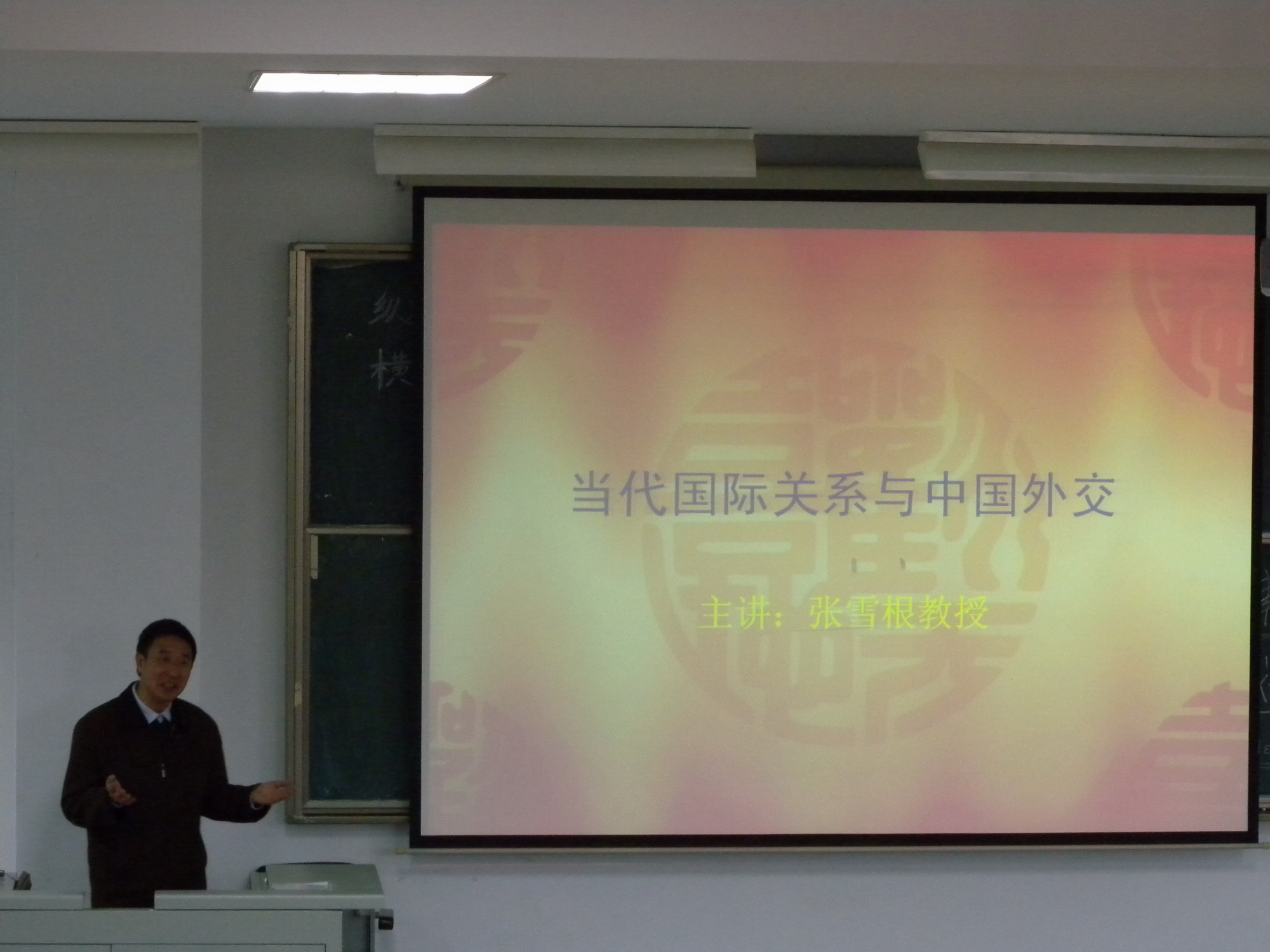 此次授课采取了报告的形式。张雪根教授以“当代国际关系与中国外交”为议题,向同学们介绍了当今世界形势和各国间错综复杂的国际关系,并重点介绍了中国在国际社会担任的角色、中国与周边国家的关系以及中美关系、中俄关系、中日关系等三大外交关系。