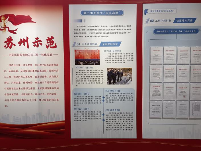接下来,支部党员在讲解员的带领下参观了《引领示范——长三角一体化发展历程展》的10个篇章34个小节,深入学习了习近平总书记关于支持长江三角洲区域一体化发展并上升为国家战略的重要指示。其中苏州示范篇作为特别融入的篇章,重点关注苏州在更高质量服务融入长三角一体化发展中的地位、举措和取得的成绩。党员们在此次学习教育活动中不仅深刻地了解到苏州如何发挥自身优势在产业创新、区域合作、生态保护等方面为长三角一体化发展作出积极贡献,而且深刻认识到中国共产党、中国人民和中国特色社会主义的伟大力量。