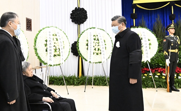 12月5日,江泽民同志的遗体在北京火化。这是习近平向江泽民同志的夫人王冶坪和亲属表示深切慰问。 新华社记者 李学仁 摄