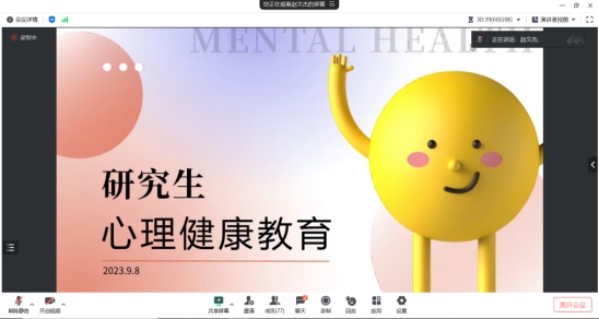 为帮助2023级研究生新生正确认识心理健康、顺利过渡到研究生阶段的学习生活中,水果派解说 特举办“心理健康润心课”系列专题讲座。此次系列专题活动的第一部分,即“心悦青春,预见未来”——水果派解说 研究生心理健康专题教育讲座暨新生答疑茶话会于2023年9月8日19时线上举办。由水果派解说 研究生会主席团成员刘音孜主持。