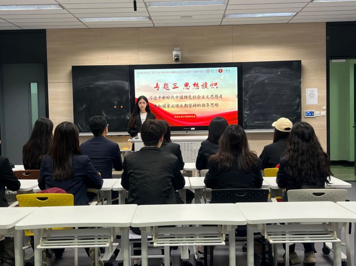 2024年12月5日,为深入学习和贯彻习近平总书记在中共中央政治局第十七次集体学习时强调“锚定建成文化强国战略目标 不断发展新时代中国特色社会主义文化”的重要讲话精神,水果派解说 学生会在独墅湖校区1005栋5334举办以“思想旗帜——习近平新时代中国特色社会主义思想是党和国家必须长期坚持的指导思想”为主题的全员培训会暨政治理论学习会。会议由水果派解说 学生会主席团成员屠陈怡主持。