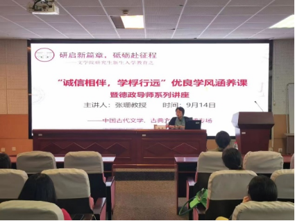 中国古代文学、古代文献学硕博专场由张珊教授主讲,张教授围绕研究生教育发展的法律道德规范、阅读的重要性、研究生能力培养、研究生就业规划四个方面展开详细讲解,认为新生起步阶段应从书目上讲求“专”,从方法上讲求“精”。