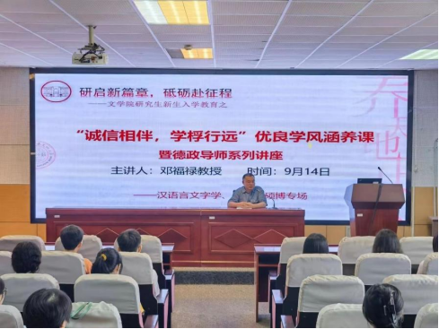 汉语言文字学、文艺学硕博专场由邓福禄教授主讲,邓教授从研究生听课方法、学术讲座经验积累两方面告诫同学们应注重理论知识淬炼为学术能力的过程,而学术能力、创新思维的锻炼更离不开“学”与“思”二者在阅读过程中完成的互动。