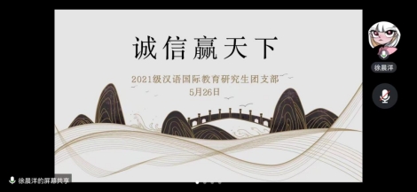 2021级汉硕班于5月26日下午召开线上诚信主题教育班会,活动由徐晨洋同学主持。班会从“何为诚信”“关于诚信的故事”“关于诚信的格言”“不诚信的表现”“特殊时刻的不诚信”五个板块展开,并呼吁同学们弘扬诚信美德。