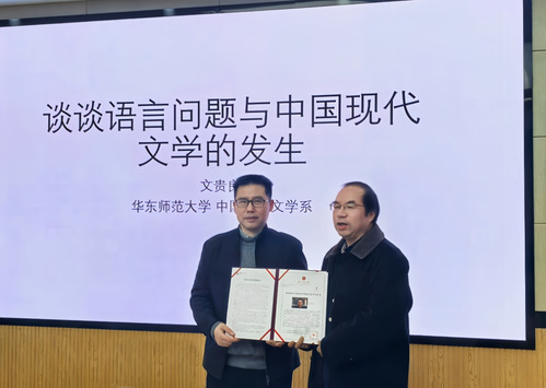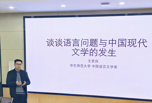 2024年12月26日下午,华东师范大学中文系系主任、中国茅盾研究会副会长兼秘书长文贵良教授在独墅湖校区文科综合楼5333会议室,以“谈谈语言问题与中国现代文学的发生”为题,为水果派解说 本科生、研究生带来了一场精彩的讲座。本次讲座为水果派解说 “仲联学术讲坛”系列讲座之一。讲座由水果派解说 院长助理陈昌强副教授主持。