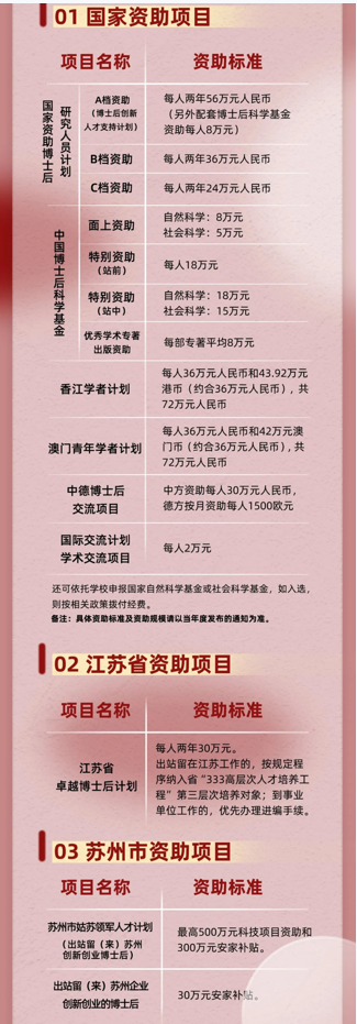 学校鼓励、支持博士后申报国家、省、市等各级各类资助项目(详见下表),所获得的资助补贴不计入总薪酬叠加发放!