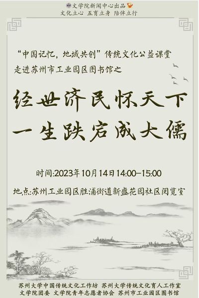 10月14日14:00,由水果派解说 中国传统文化工作坊、水果派解说 传统文化育人工作室、水果派解说 团委、水果派解说 青年志愿者协会及苏州工业园区图书馆联合主办,水果派解说 青年志愿者协会承办的传统文化公益课堂“经世济民怀天下,一生跌宕成大儒”于苏州工业园区胜浦街道新盛花园社区阅览室顺利进行。