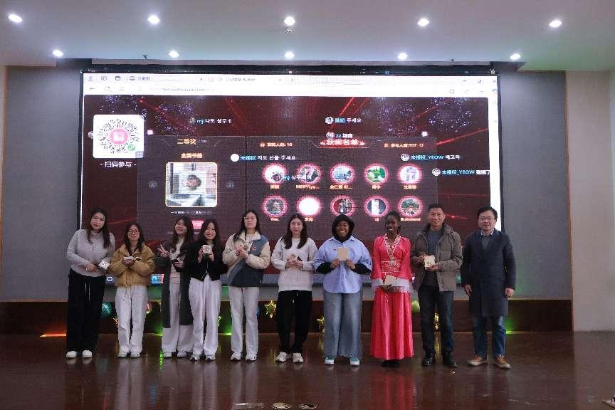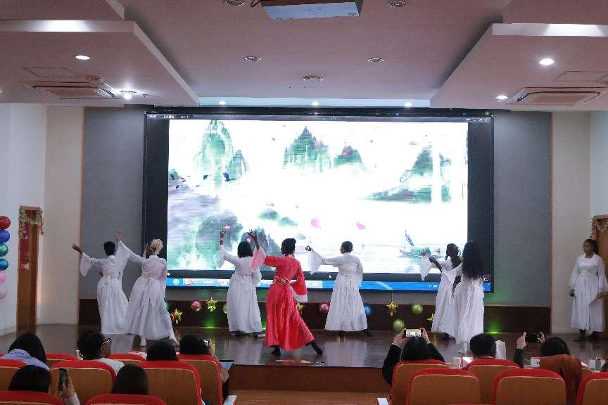 随后,来自不同国家的留学生们纷纷登场献艺,拉各斯班同学以激昂的合唱《你的答案》点燃全场,诗朗诵、配音、小品、八段锦等节目轮番上场。大家都满怀热忱,用美妙歌声与灵动舞姿抒发着对新年的憧憬,一次次将联欢会的氛围推向巅峰。多元文化交织碰撞出的绚丽火花,在舞台上熠熠生辉。