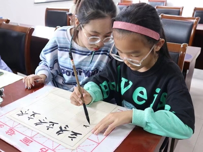 在充分了解立冬文化后,小朋友们开始练习用毛笔书写“立冬”二字。志愿者帮助小朋友们调整坐姿和握笔姿势,为小朋友们讲解书法的运笔等基础知识。书写的过程中一些小朋友不慎将墨汁沾到手上,志愿者们耐心地为小朋友清理,学习氛围浓郁,其乐融融。在志愿者和文化社成员的指导下小朋友们圆满完成了书法创作。