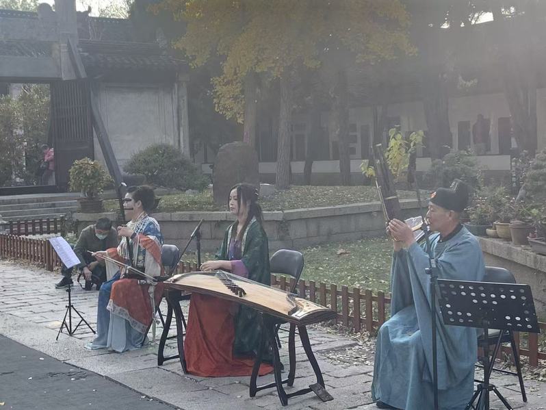 古乐表演环节成为活动的一大亮点。悠扬的古筝、清雅的笙与古朴的二胡轮番奏响,经典曲目在文庙庭院中回荡,旋律婉转悠扬,让同学们沉浸在传统音乐的空灵意境中。大家认真聆听演奏者对乐器历史、演奏技巧的讲解,不时点头称赞,现场掌声此起彼伏,充分感受着传统乐器的独特韵味与艺术感染力。