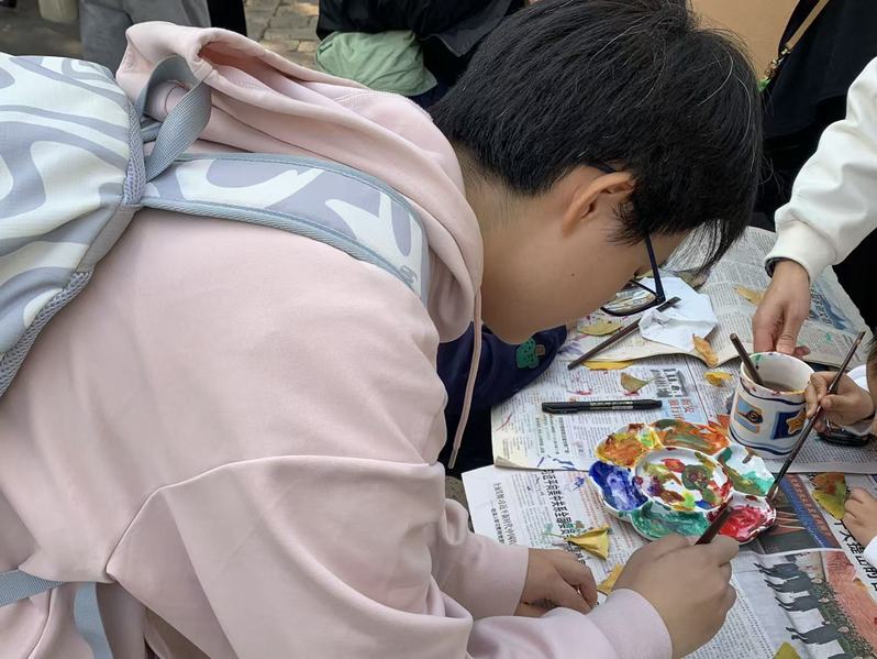 活动的最后,大家兴致勃勃地动手制作银杏贺卡。在金黄的银杏叶上,同学们自由创作,或拼贴成画,或提笔寄语,每一张贺卡都融入了自己对传统文化的理解与情感。何薇老师也加入交流,和大家一起分享创作体会,鼓励同学们在日常中继续发现与传承文化之美。