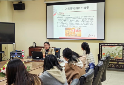 最后,宋书记带领预备党员重温入党誓词,面向党旗庄严宣誓。宋书记结合主题教育,提出入党誓词是中国共产党党员的宣誓书、是党员对党组织的承诺书、是加强党性修养的座右铭,指出要在组织上入党首先要在思想上入党,思想上入党是根本。勉励同学们牢记入党誓词,不断叩问初心、守护初心,不断坚守使命、担当使命,始终做到初心如磐、使命在肩。