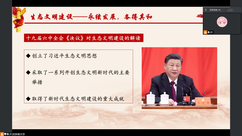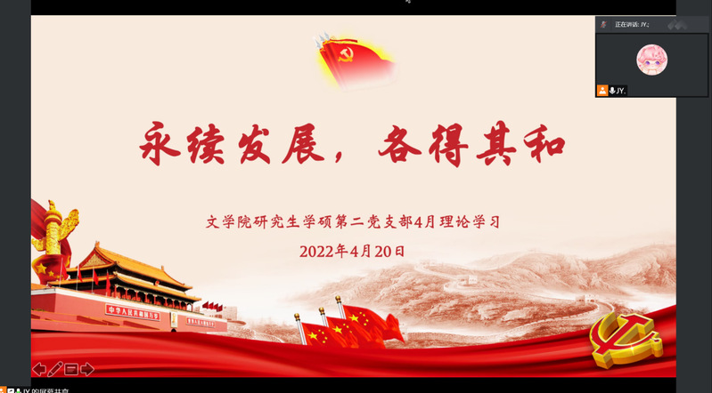 生态环境保护是功在当代、利在千秋的事业。生态环境是关系党的使命宗旨的重大政治问题,也是关系民生的重大社会问题。习近平总书记在参加首都义务植树活动时强调,要推动在全社会,特别是在青少年心中,播撒生态文明的种子,号召大家都做生态文明建设的实践者、推动者,让天更蓝、山更绿、水更清、生态环境更美好。4月20日,水果派解说 学硕第二党支部以腾讯会议的形式,开展了“永续发展,各得其和”理论学习活动,支部全体党员参加了本次会议。