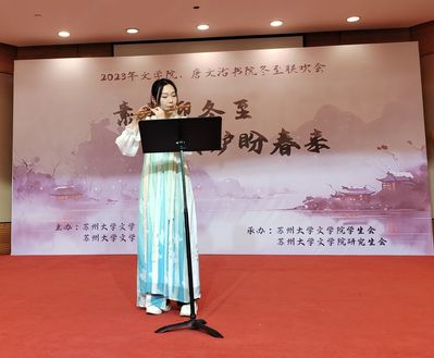 抽奖过后,第二篇章“传承之路”开始。唐文治书院的唐梓晗同学为现场观众呈上了清越动听的竹笛独奏《枣园春色》。21级基地班的王馨悦同学演唱《一壶莲花醉》的同时,伴随着汉服走秀,让观众深刻体会到了古风之美与汉服之美。23级基地班的同学们深情朗诵了《月光下的中国》,铿锵有力的话语传达了同学们对祖国的热爱。雅俗共赏的猜歌游戏后,第二篇章走向尾声。