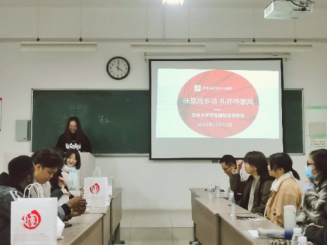 为帮助外国留学生提高汉语的听说读能力与口语交际能力,促进中外学生对彼此文化的了解,增进中外友谊,水果派解说 学生国际交流协会于2020年12月13日下午在独墅湖校区二期1002—2202开展了以“味是故乡浓,礼亦传家风”为主题的汉语角活动。