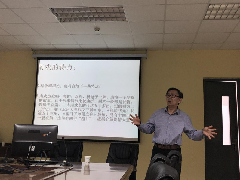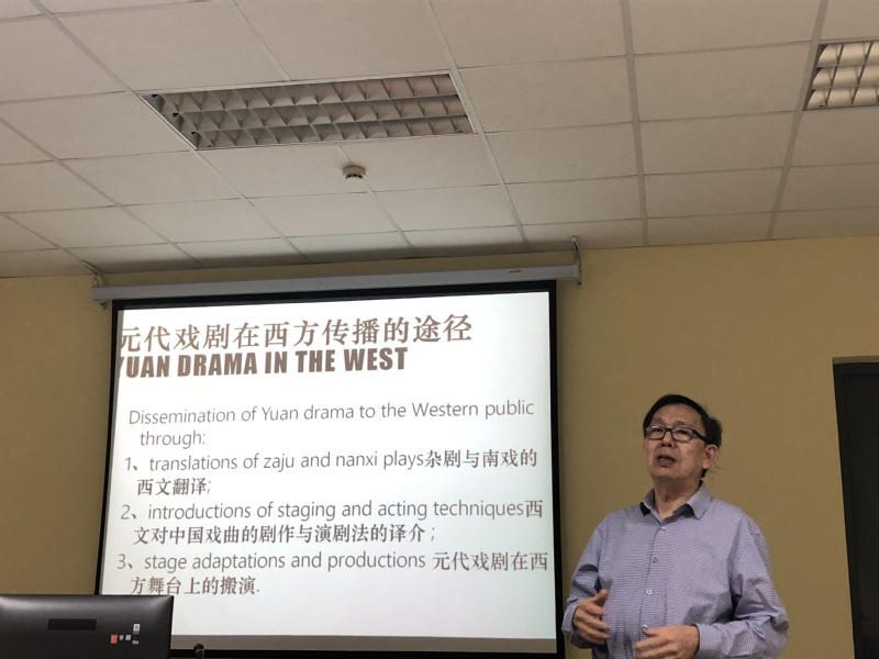 讲座伊始都教授介绍了中国戏剧的简史以及北杂剧与南戏的发展历程,让大家对讲座的背景知识有了一定的了解。都教授从戏剧的酝酿时期——远古至唐代开始讲述了中国古代戏剧与地方戏的曲折发展,由此引出了讲座的第二个内容:元代戏剧在西方的传播途径。