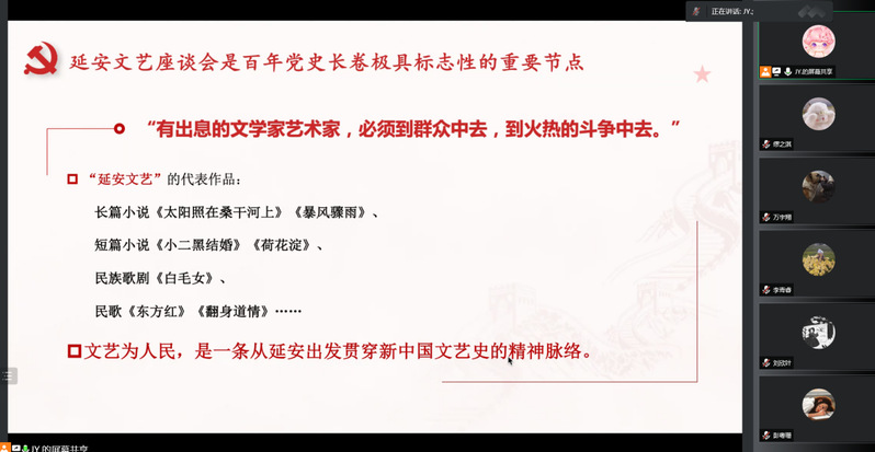 为持续深入学习贯彻毛泽东同志《在延安文艺座谈会上的讲话》精神,增强文化自觉、坚定文化自信,坚持“二为”方向和“双百”方针,发扬党的文艺工作优良传统,为书写新时代人民史诗凝聚起奋进新征程文艺力量,6月29日,水果派解说 研究生学硕第二党支部以腾讯会议的形式,进行集体学习,重温毛泽东同志《在延安文艺座谈会上的讲话》中的重要精神,支部全体党员参加了本次会议。