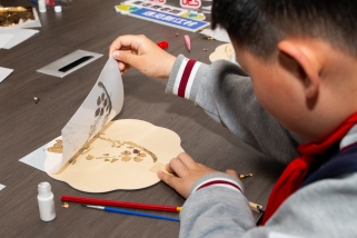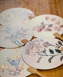 时间掺杂着木屑,繁华永存在彩箔,流光熠闪于心间。主讲人王亚先从扇子、苏绣、烧箔三部分介绍中国传统工艺文化,并通过有奖竞猜等活动提高小朋友们的参与度。结合读书日主题,主讲人准备了两个关于扇子的名著小故事:《诸葛亮捉白羽扇指麾众军》和《孙悟空三借芭蕉扇》,小朋友们听得聚精会神,十分入迷。在了解完手工作品和讲解团扇的制作要领与注意事项后,大家在志愿者辅助下以箔纸为墨彩,共同描绘华夏美学,体验烧箔工艺魅力。