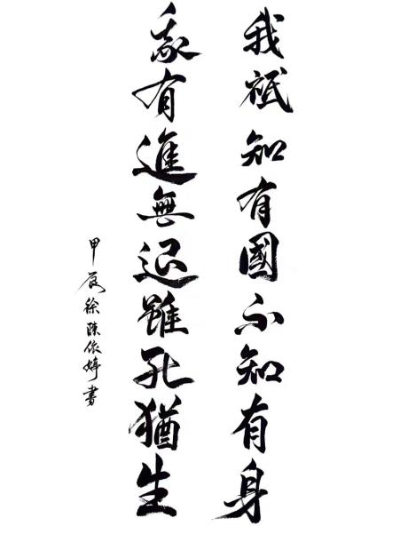 【创作灵感】“我只知有国,不知有身!我有进无退,虽死犹生”节选自周瘦鹃的《卢沟桥之歌》。1937年7月7日,日本侵略者悍然发动了卢沟桥事变。中华民族抗日战争全面爆发。8日,中共中央通电全国,号召中国军民团结起来,共同抵抗日本侵略者。全国各族各界人民热烈响应,抗日救亡运动空前高涨。周瘦鹃听闻卢沟桥的消息,于满腔悲愤中写下了《卢沟桥之歌》,表达了捍卫民族尊严不死不休的慷慨豪情。2022级硕士研究生徐陈依婷深感于苏州人周瘦鹃的爱国热情,用毛笔记录下了这句诗。