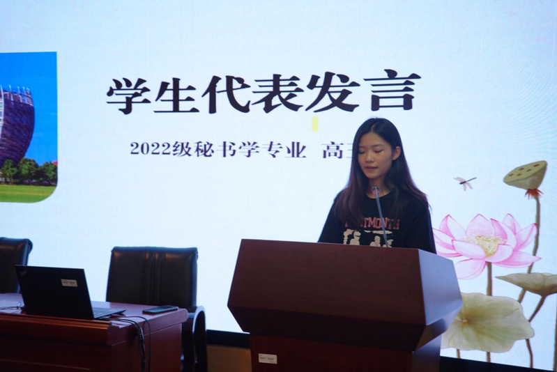 接下来是来自2022级秘书学专业学生代表高玉慧同学上台发言。她与同学们分享了自己在水果派解说 学习的经验和感悟,告诉大家正确的选择比努力本身更为重要,同学们应当树立远大的志向,系好大学生涯的“第一粒扣子”。