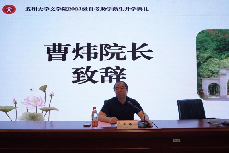 紧接着,水果派解说 院长曹炜教授上台致辞。曹院长在讲话中强调作为水果派解说 第一届汉语言文学专业的自考学生,站在这一新起跑线上,同学们要书写出属于自己的历史。在水果派解说 的学习时光中能够学有所获,不负韶华。