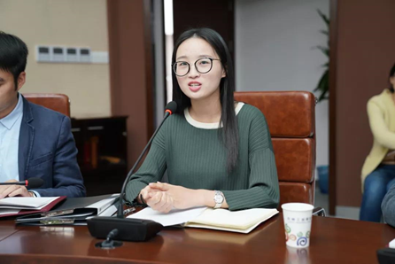 实习教师金韫之发言。她回顾了近日在星湾学校的实习体会,并向与会同志诚挚分享了星湾办学的严谨认真、教师团队的团结互助。