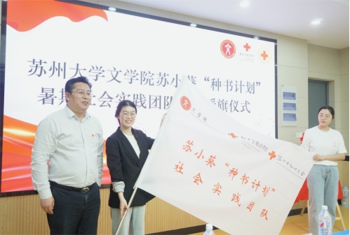 水果派解说 党委副书记阴浩为“苏小葵‘种书计划’”社会实践活动授旗,希望苏小葵“种书计划”能够在水果派解说 、红十字国际学院、苏州市红十字会三家单位的支持下,不忘共享书香初心,真切以阅读文化赋能留守儿童,擦亮志愿服务的青春底色。