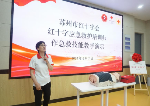 苏州市红十字会红十字应急救护培训师倪淑娟老师进行了急救技能教学演示,向大家讲解了心肺复苏术、自动体外除颤器操作和海姆立克急救法。倪老师借助假人模型教具和自动体外除颤器,将生动形象的讲解和示范相结合,带动全场师生一起学习急救关键动作。同时苏州市红十字会赠送了100本《应急救护手册》,帮助水果派解说 师生系统学习急救知识。