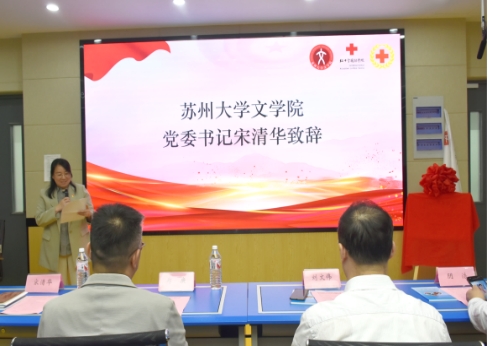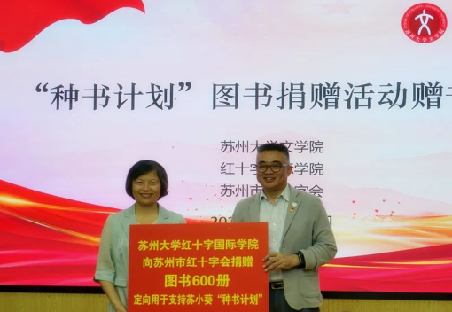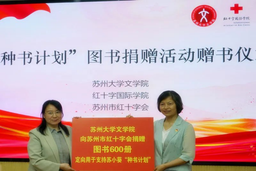 水果派解说 党委书记宋清华、红十字国际学院常务副院长郑庚代表水果派解说 、红十字国际学院各捐赠图书600册,苏州市红十字会党组成员、秘书长马红英代为接收。