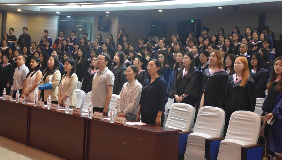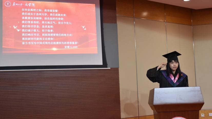 师生代表发言结束之后,在毕业生代表赵钰晗同学的领誓下,全体毕业生庄严宣誓,未来会主动承载东吴精神,担负时代使命;情系母校,养天地正气,法古今完人,奋力书写青春篇章!