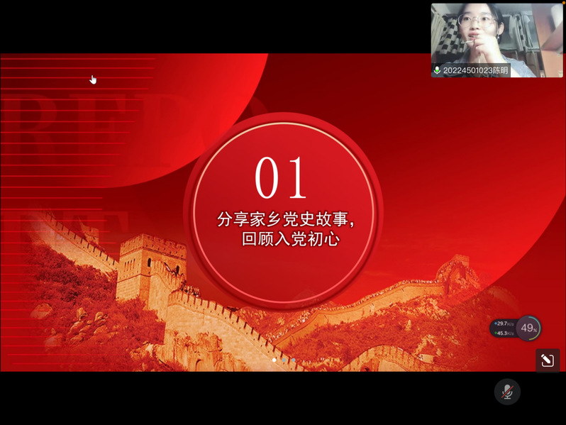 会议开始,党支部书记徐成煜宣布了整个活动的流程,本次党日活动共包含四个部分:第一部分是家乡党史故事的分享;第二部分是集体观看短片 《精神的追寻:伟大建党精神》;第三部分是各位党员表达对党的二十大的美好寄语;第四部分是共同重温入党誓词,牢记初心使命。