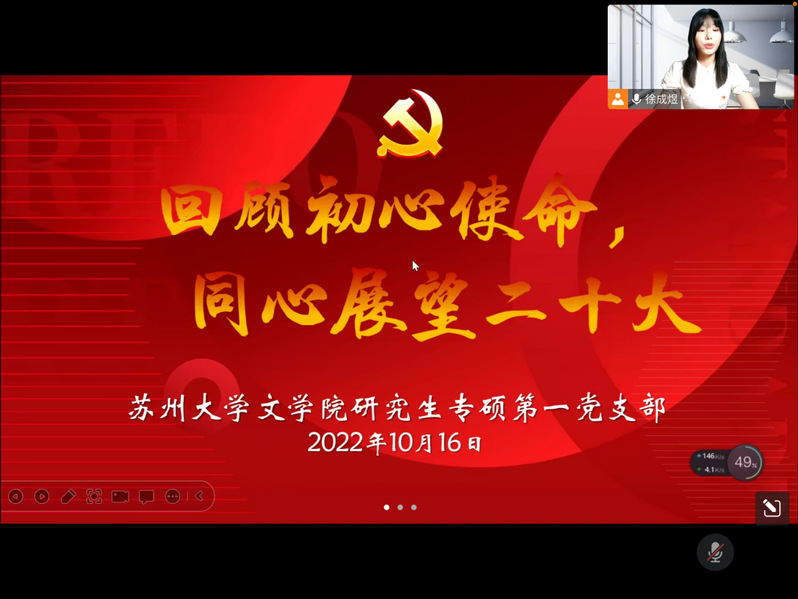 十年砥砺奋发,十年硕果累累,正值吴地金秋,桂子飘香,党的二十大召开前期,为了深入学习贯彻习近平新时代中国特色社会主义思想,迎接中国共产党第二十次全国代表大会,深入把握中国精神的时代精华,水果派解说 研究生专硕第一党支部于2022年10月10日19:00在线上开展了“回顾初心使命,同心展望二十大”主题党日活动,本次活动由党支部书记徐成煜同志主持,支部全体党员参与了本次活动。