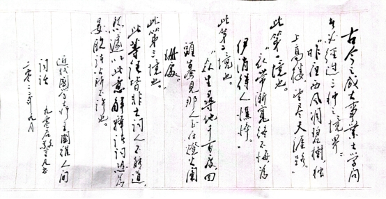 在被问到对青年学子的指导与期待时,蔡老师拿出了自己的书法作品,借用了王国维先生对于治学三重境界的论述,告诫青年学生要树立远大理想,勤奋专注,不断追求更高的境界。蔡老师一字一字地指着读,在场的人也被他的恳切打动,情不自禁地跟着一起诵读,“古今之成大事业、大学问者,必经过三种之境界:‘昨夜西风凋碧树,独上高楼,望尽天涯路’。此第一境也……”临告别时,蔡老师仍不忘叮嘱,“你们要成为国家栋梁啊”,眼中满是殷切的期待。