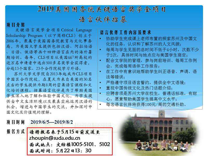 2019美国国务院关键语言奖学金项目语言伙伴招募